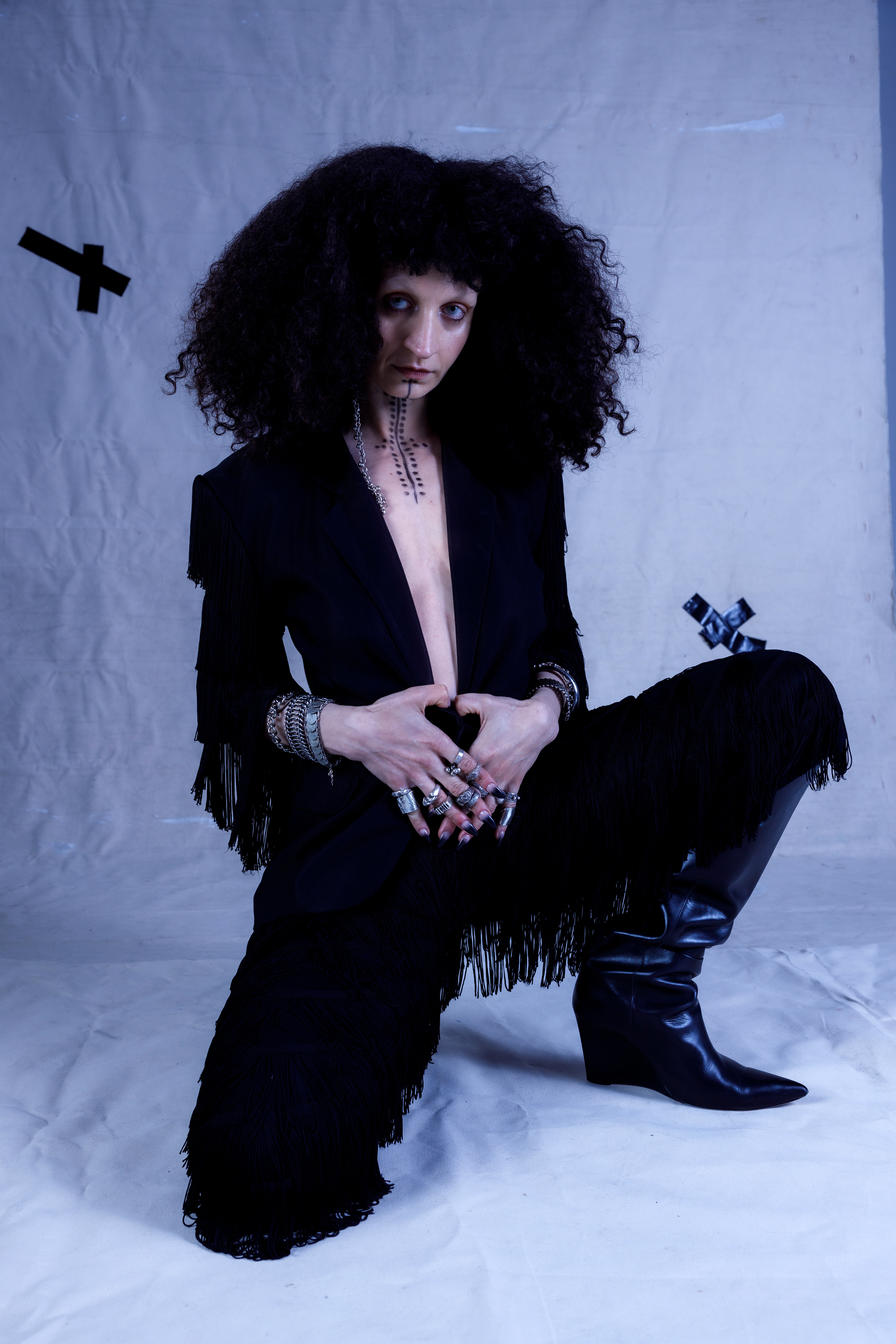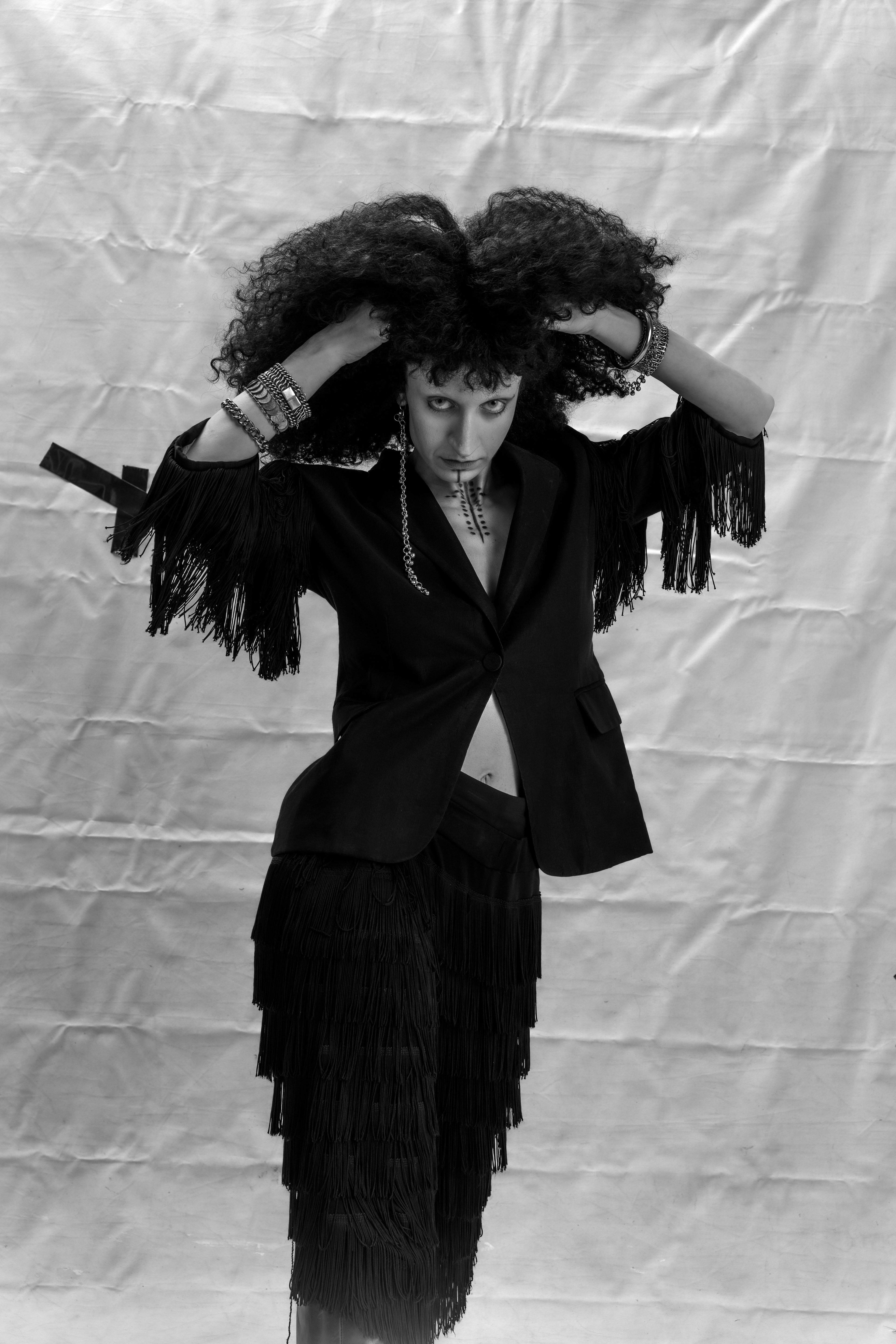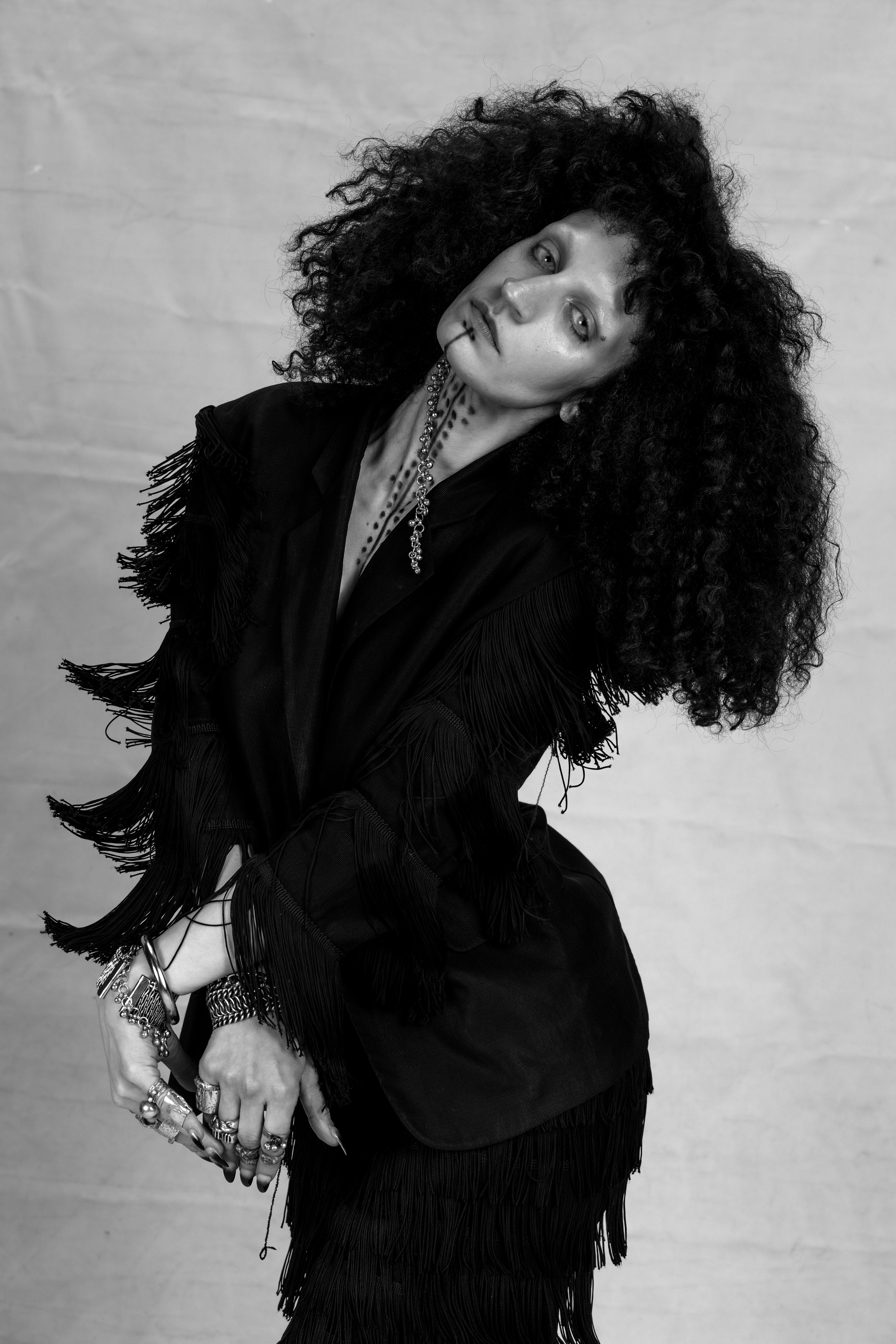 ‘ Growing up between clashing worlds, I often felt like an outsider, like the antagonist in my own story—never fitting neatly into any label. I was inspired by the women like my great grandmother who for generations got these deq tattoos imbued with wishes, fortune, and protection. All these inherited stories and traditions simultaneously felt alien to me. Just as a tattoo is a ritualized act of deploying one’s own chosen identity, I am using this moment to question the significance of identity and heritage. I am not that I am not’ MAIA ABBAS